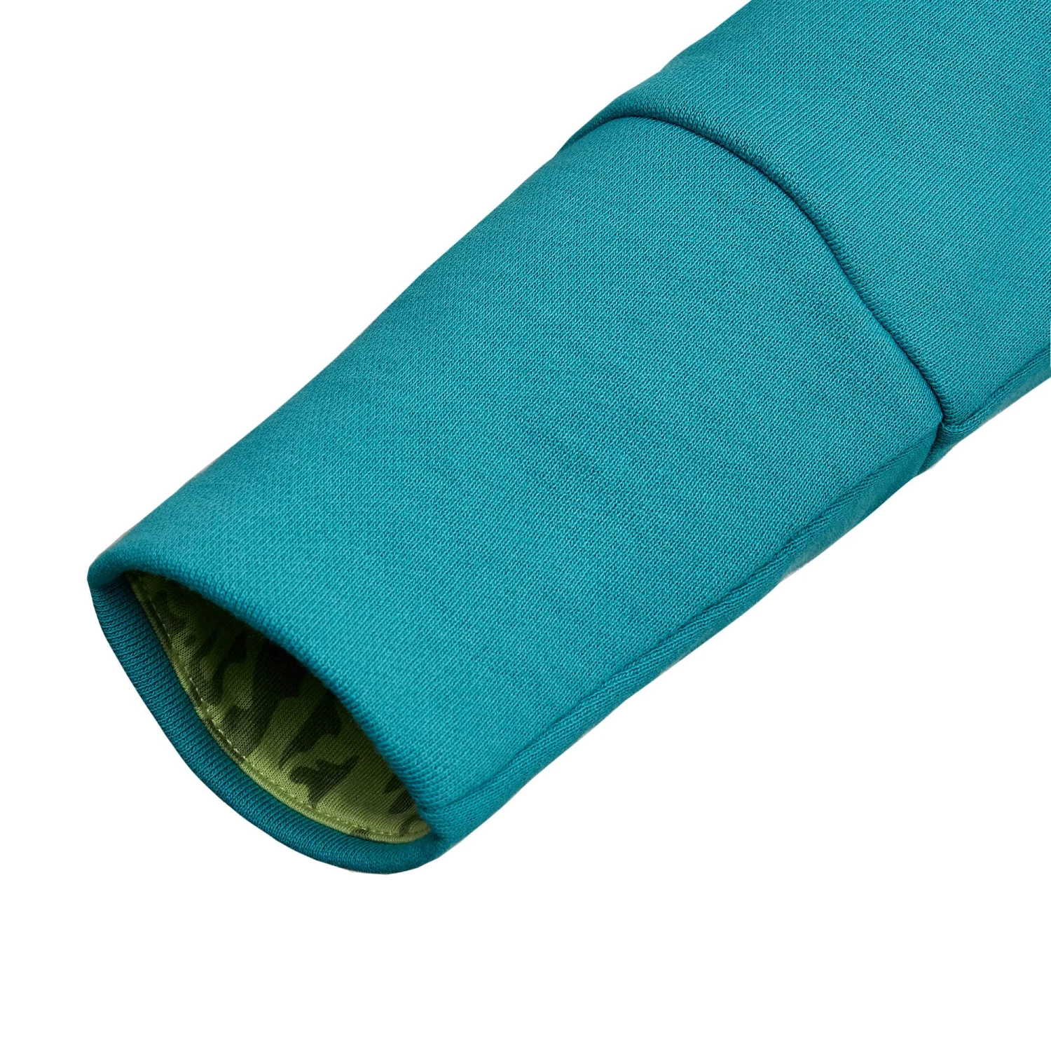 Das Innenfutter des Hoodies ist mit einem Bergkontur-Print dekoriert. Ein weiterer Hingucker: die diagonal vernähte Känguru-Tasche auf der Front und der hinten abgerundete Bundverlauf.